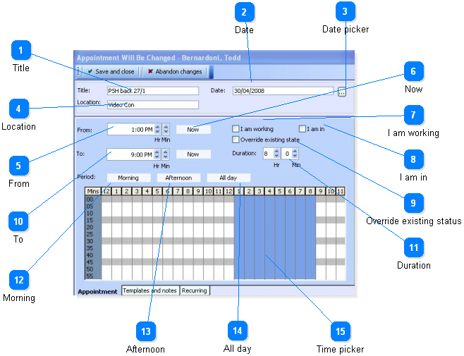 An appointment is simply an event for an object.   If the object is a person then the appointment might be a meeting, or whether they are in the office for the day.   If the object is a meeting room, then the appointment might be when the room is booked and by whom.   If the object is a vehicle or an asset like a projector, then the appointment might be when the asset is taken out and who has taken it.   The start time and duration of appointments can be set in three ways.
